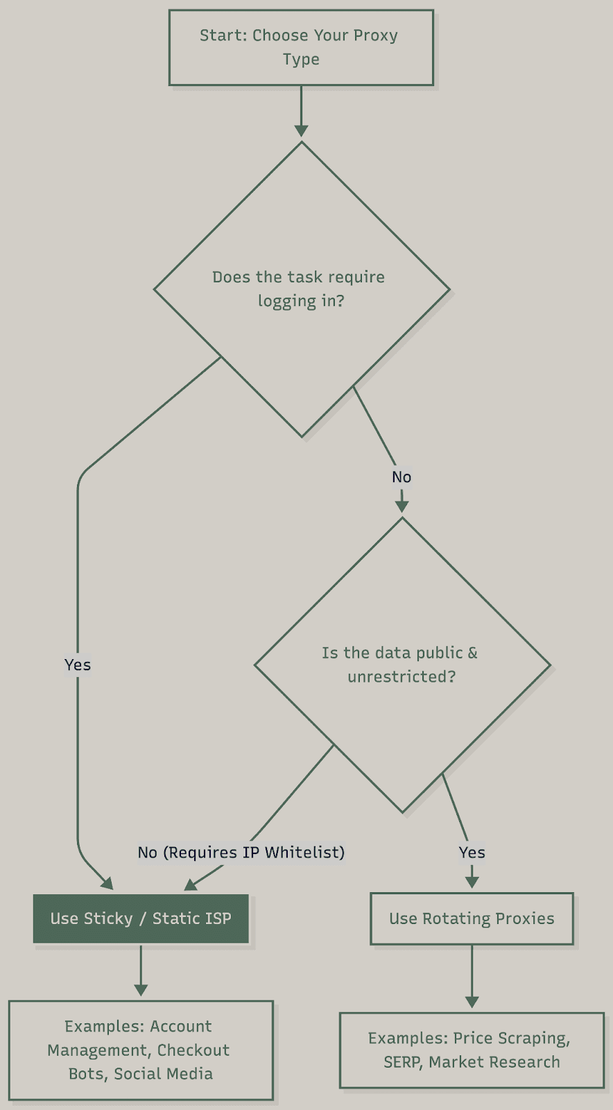 Test method: Switch IPs mid-session. If authentication breaks, use sticky. If it works, rotating is safe.