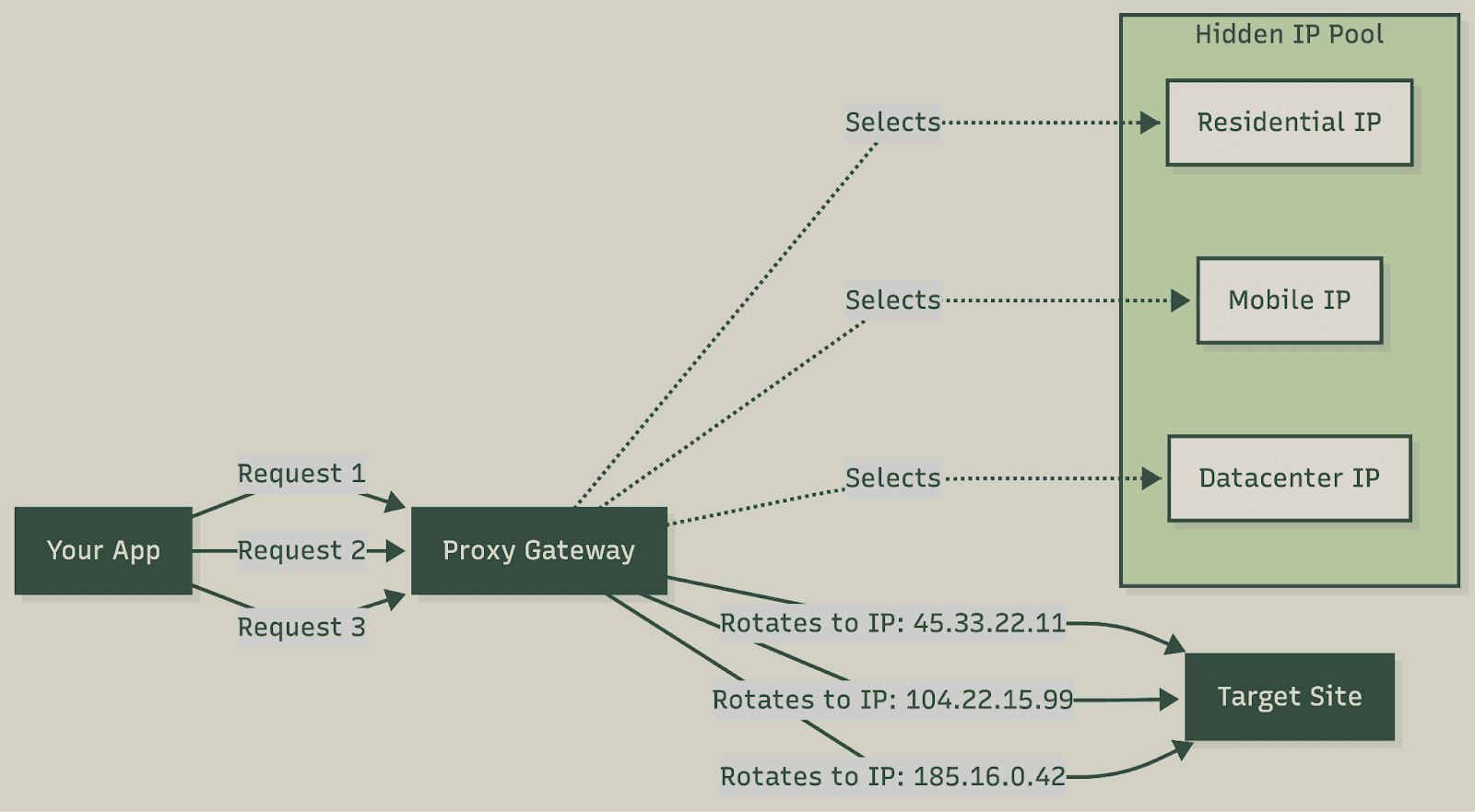 The architecture works like this: you send requests to a single gateway endpoint (often called a backconnect proxy). The gateway selects an IP from its pool, forwards your request through that IP, and returns the response. On the next request, it can assign a completely different IP or maintain a sticky session (keeping the same IP), depending on your configuration.